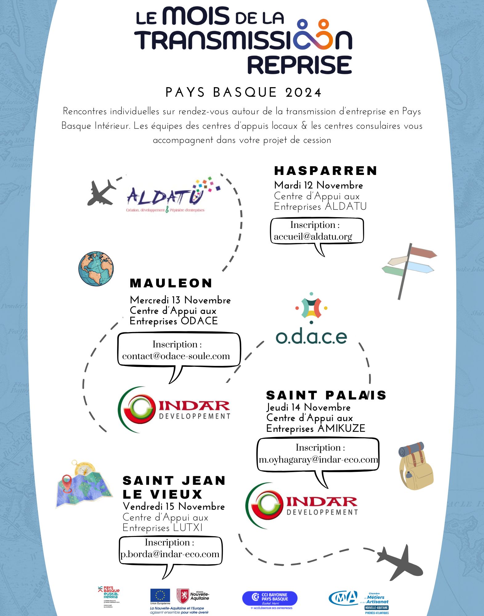 ➡️ALDATU, INDAR et ODACE, en partenariat avec la CCI et la CMA, profiteront de l’évènement organisé par la Région Nouvelle Aquitaine « Mois de la transmission-reprise en Nouvelle Aquitaine » pour y dédier 4 journées.