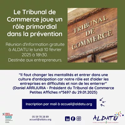 Le Centre d'Appui aux Entreprises ALDATU vous invite à une réunion d'information gratuite animée par Messieurs Daniel ARRIJURIA Président et Pierre LALANNE Juge du Tribunal de Commerce de Bayonne le lundi 10 février 2025 à 18h30 à ALDATU, 30 rue Léon Larregain à HASPARREN.
